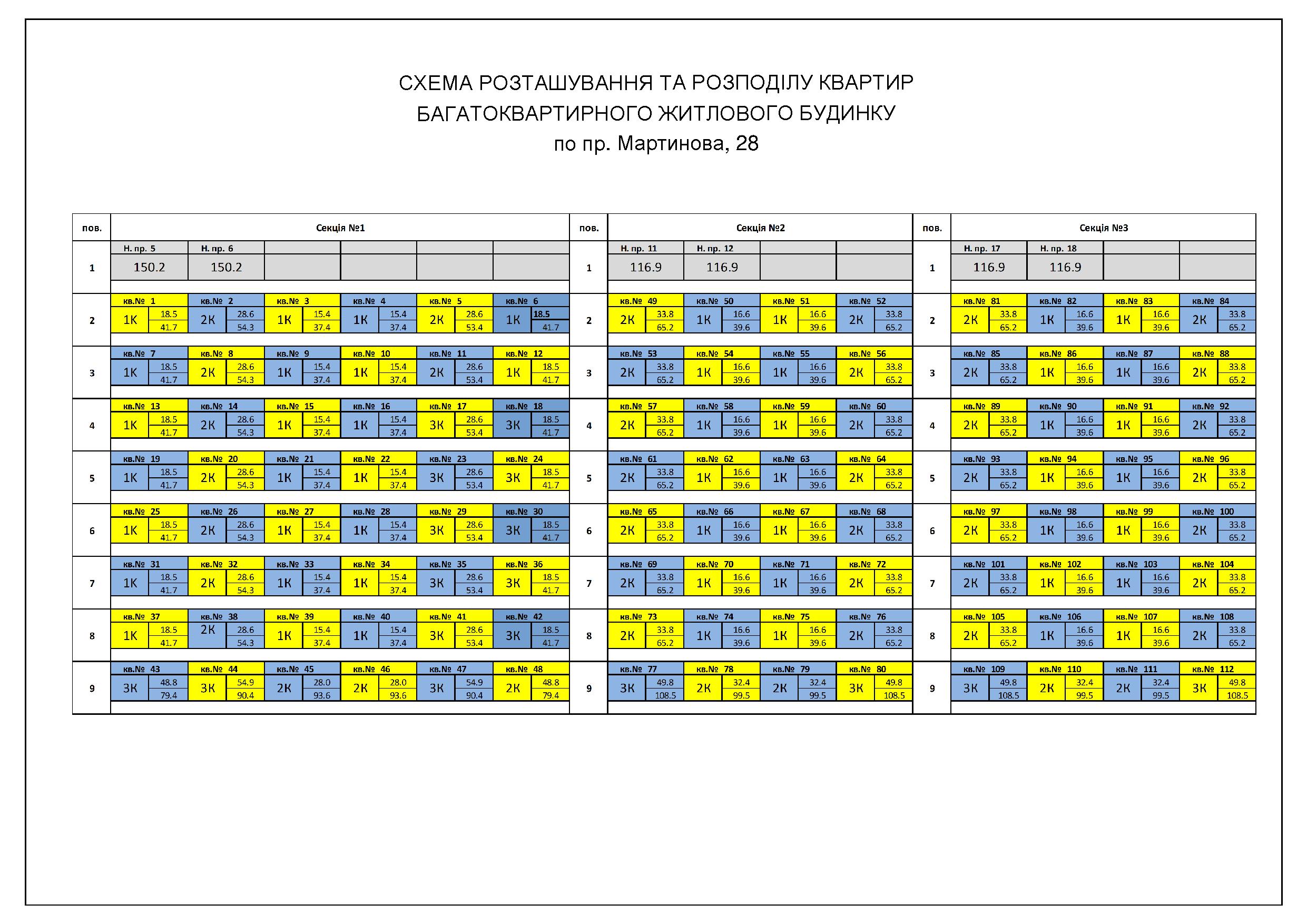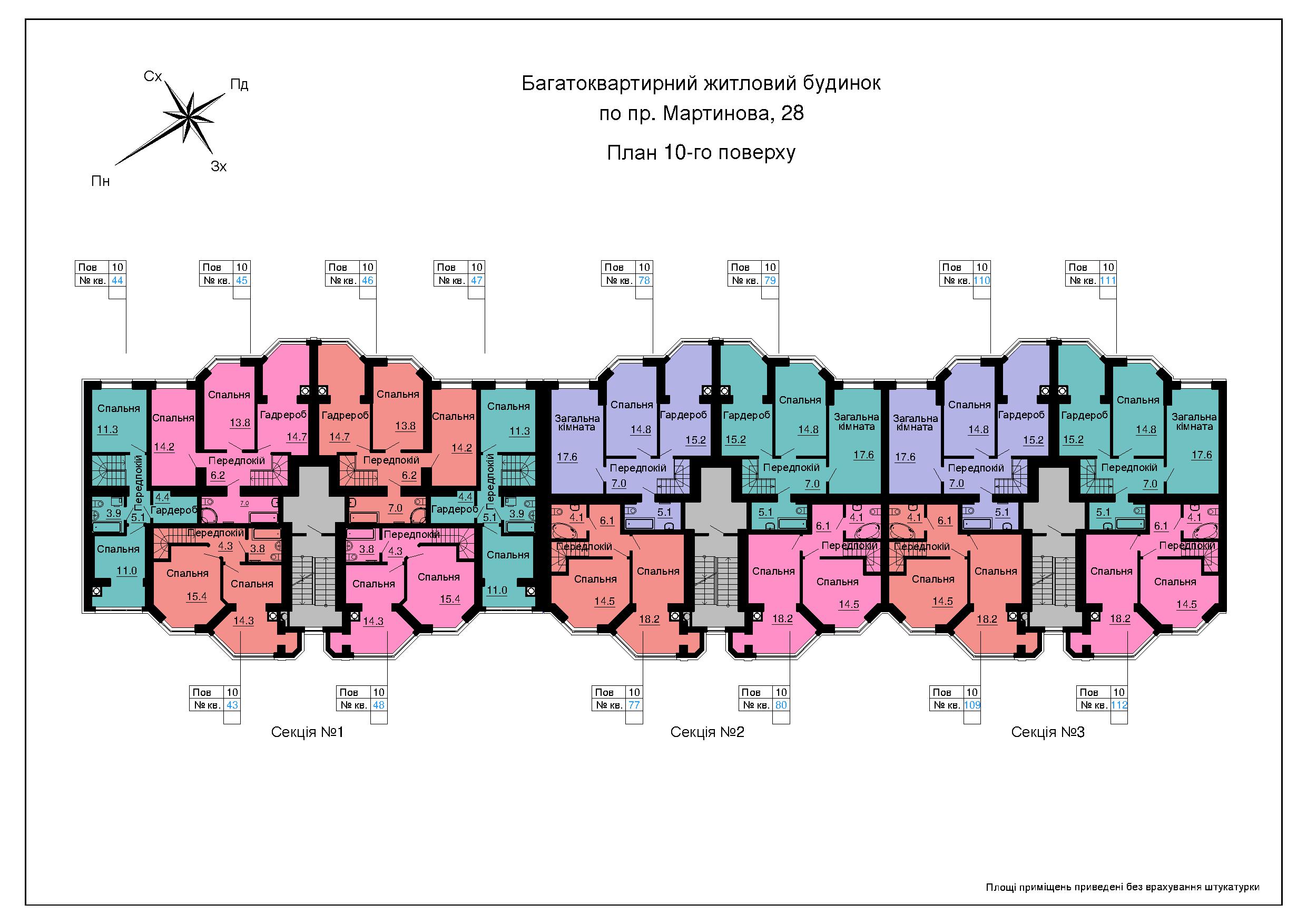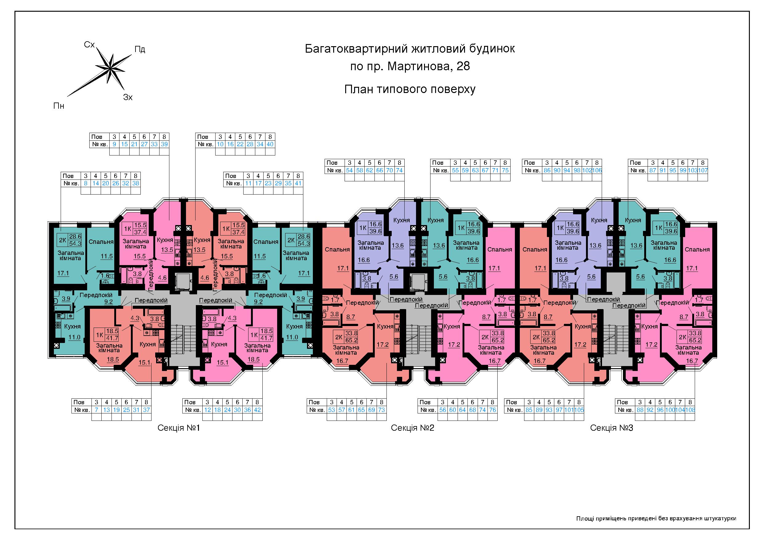 Будинок по проспекту Мартинова під номером 28, 10 поверхів, 3 секції, три під’їзди.