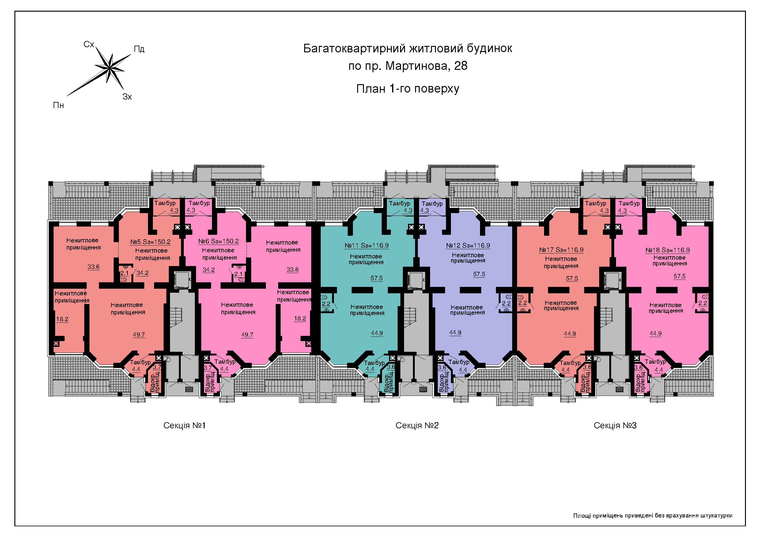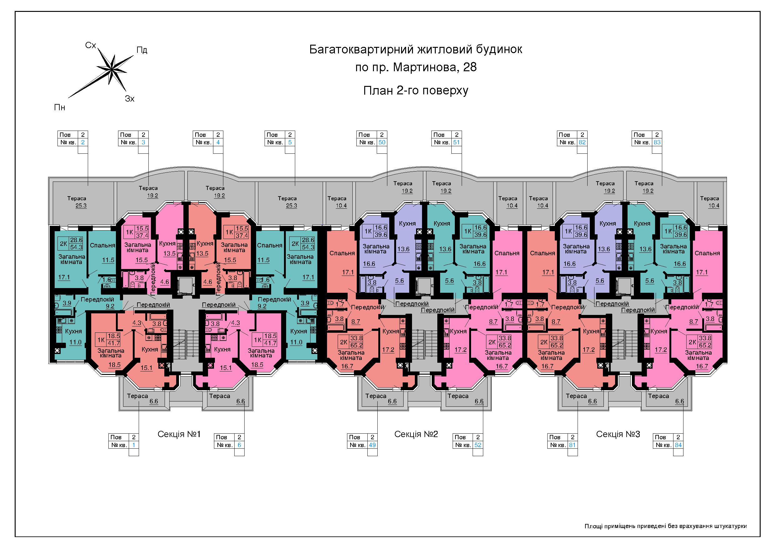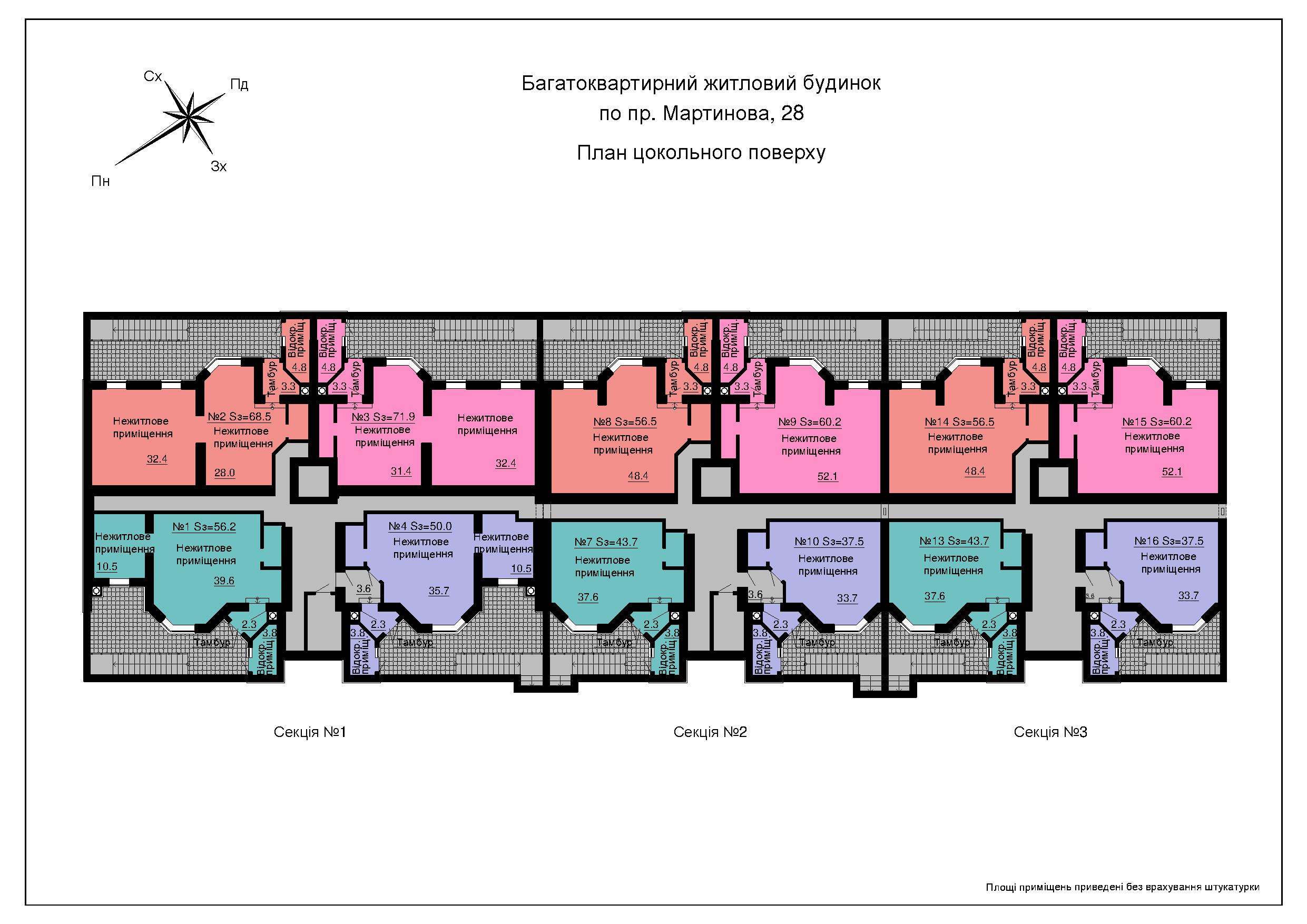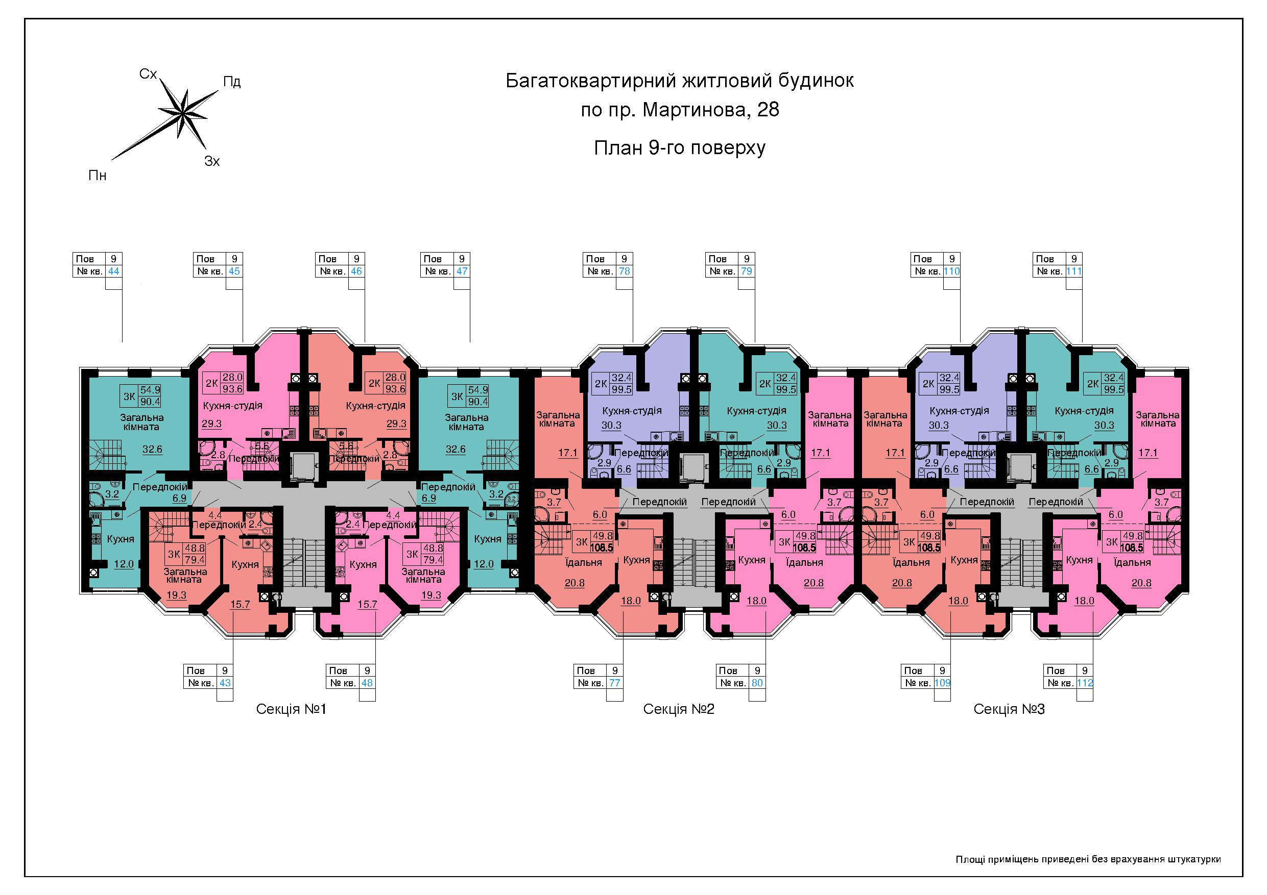 Будинок по проспекту Мартинова під номером 28, 10 поверхів, 3 секції, три під’їзди.