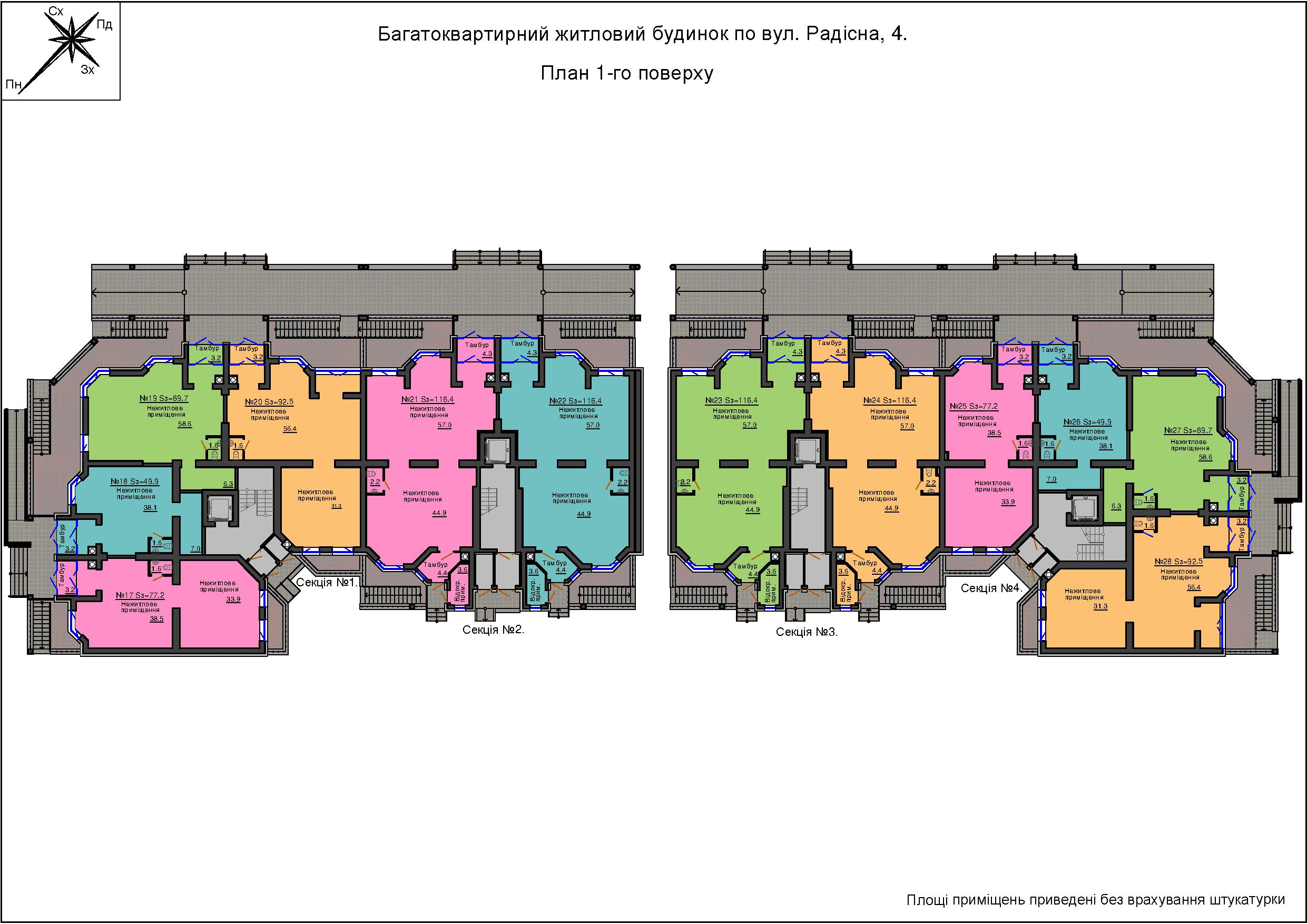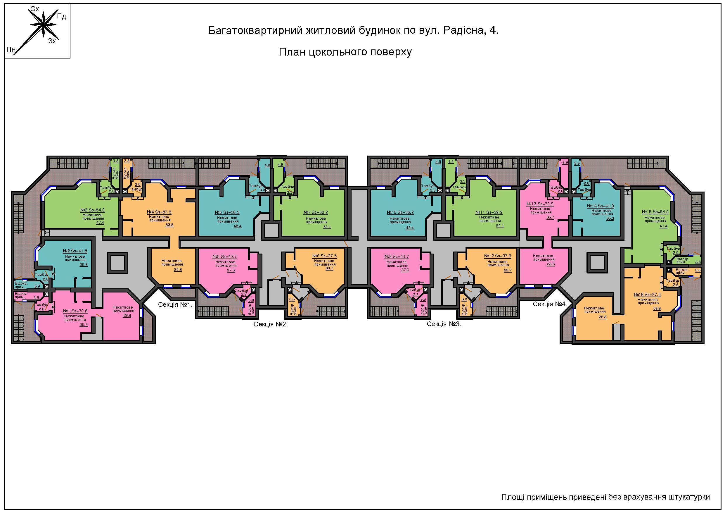 Перший і цокольний відведені під нежитлові приміщення. Верхні два поверхи займають дворівневі квартири.
