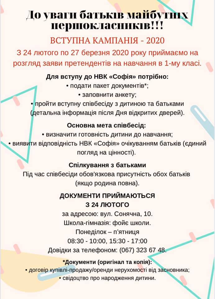 Увага!!! Друзі, батьки майбутніх першачків, з 24 лютого по 27 березня стартує вступна кампанія до НВК “Софія”.
