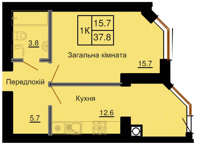 ОДНОКІМНАТНА КВАРТИРА 37.80 М/КВ