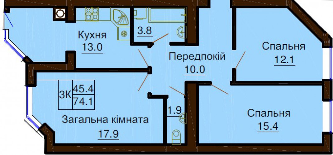 3-Х КІМНАТНА КВАРТИРА 74.10 М/КВ