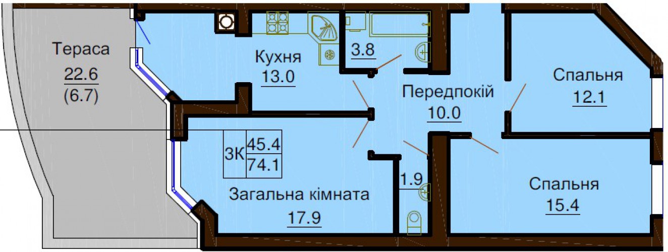 3-Х КІМНАТНА КВАРТИРА 74.10 М/КВ