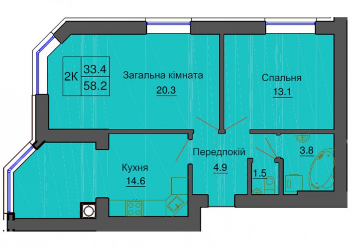 2-Х КІМНАТНА КВАРТИРА 58.20 М/КВ