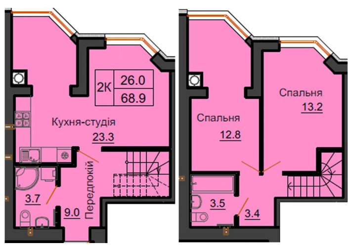 ДВОРІВНЕВА КВАРТИРА 68.90 М/КВ