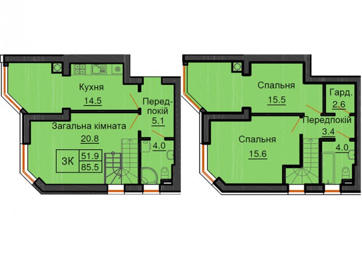 ДВОРІВНЕВА КВАРТИРА 85.50 М/КВ