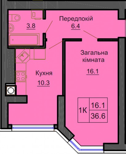ОДНОКІМНАТНА КВАРТИРА 36.60 М/КВ