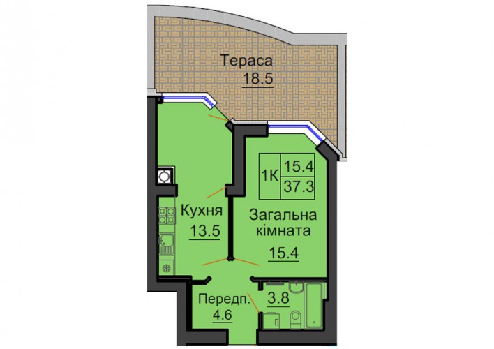 ОДНОКІМНАТНА КВАРТИРА 37.30 М/КВ