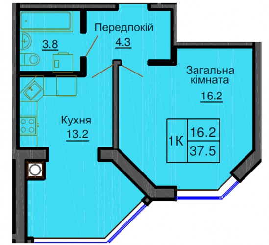 ОДНОКІМНАТНА КВАРТИРА 37.50 М/КВ