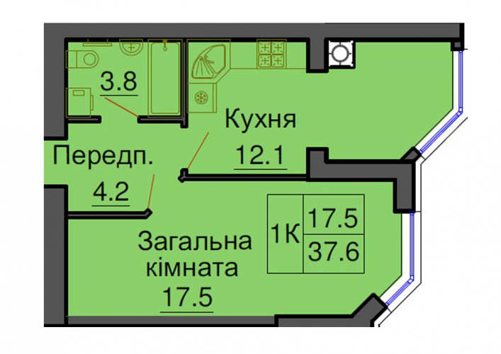 ОДНОКІМНАТНА КВАРТИРА 37.60 М/КВ