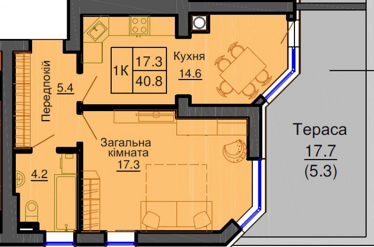 ОДНОКІМНАТНА КВАРТИРА 40.80 М/КВ