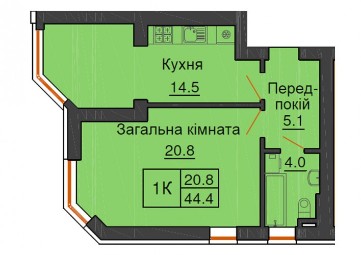 ОДНОКІМНАТНА КВАРТИРА 44.40 М/КВ