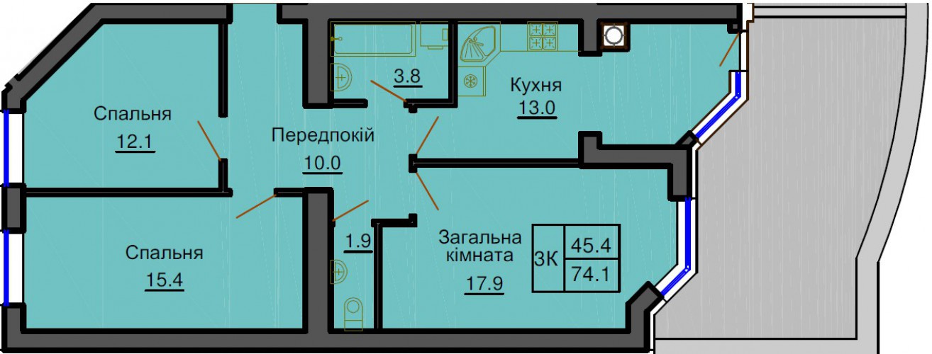 3-Х КІМНАТНА КВАРТИРА 74.10 М/КВ