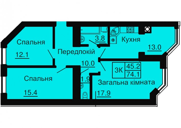 3-Х КІМНАТНА КВАРТИРА 74.10 М/КВ