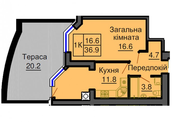 ОДНОКІМНАТНА КВАРТИРА 36.90 М/КВ