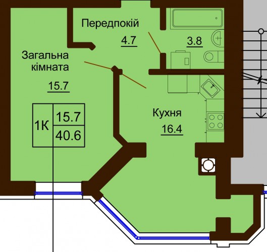ОДНОКІМНАТНА КВАРТИРА 40.60 М/КВ