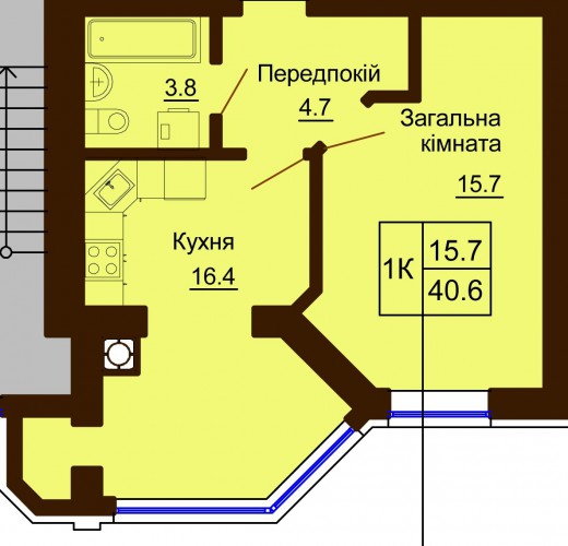 ОДНОКІМНАТНА КВАРТИРА 40.60 М/КВ
