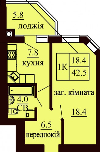 ОДНОКІМНАТНА КВАРТИРА 42.50 М/КВ