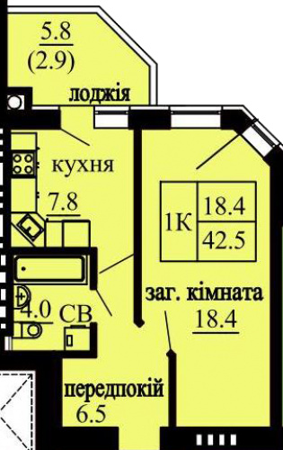 ОДНОКІМНАТНА КВАРТИРА 42.50 М/КВ