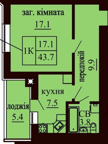 ОДНОКІМНАТНА КВАРТИРА 43.70 М/КВ