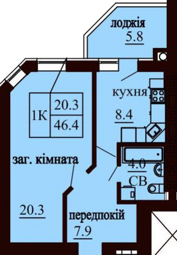 ОДНОКІМНАТНА КВАРТИРА 46.40 М/КВ