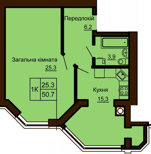 ОДНОКІМНАТНА КВАРТИРА 50.70 М/КВ