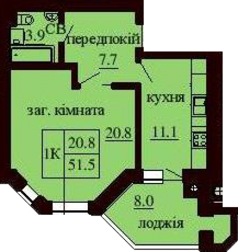 ОДНОКІМНАТНА КВАРТИРА 51.50 М/КВ