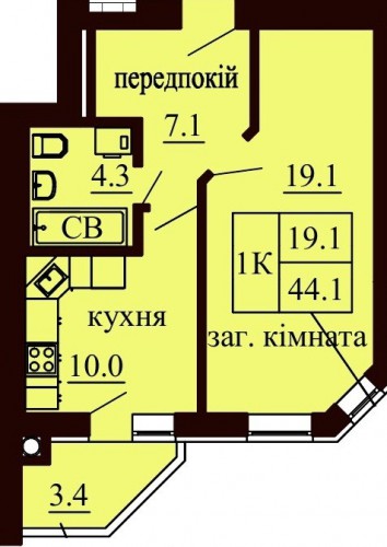 ОДНОКІМНАТНА КВАРТИРА 44.10 М/КВ