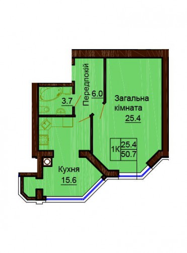 ОДНОКІМНАТНА КВАРТИРА 50.70 М/КВ