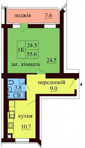 ОДНОКІМНАТНА КВАРТИРА 55.60 М/КВ