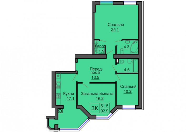3-Х КІМНАТНА КВАРТИРА 92.90 М/КВ